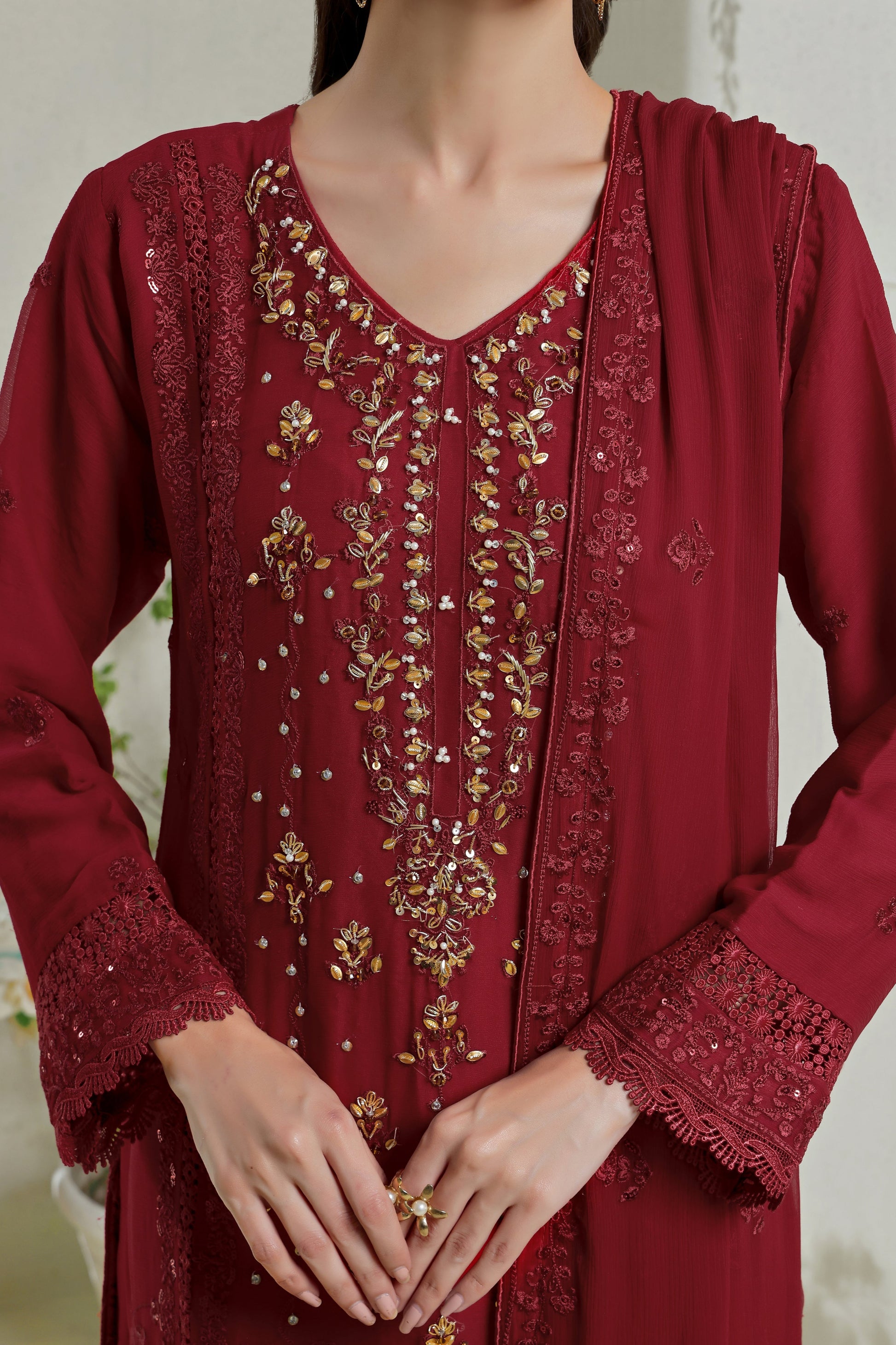 Embroidered Chiffon Shirt with hand crafted Cutwork border